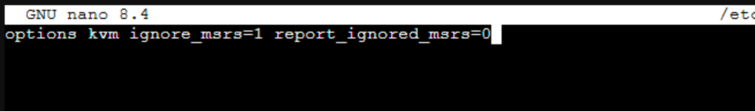 options kvm ignore_msrs=1 report_ignored_msrs=0